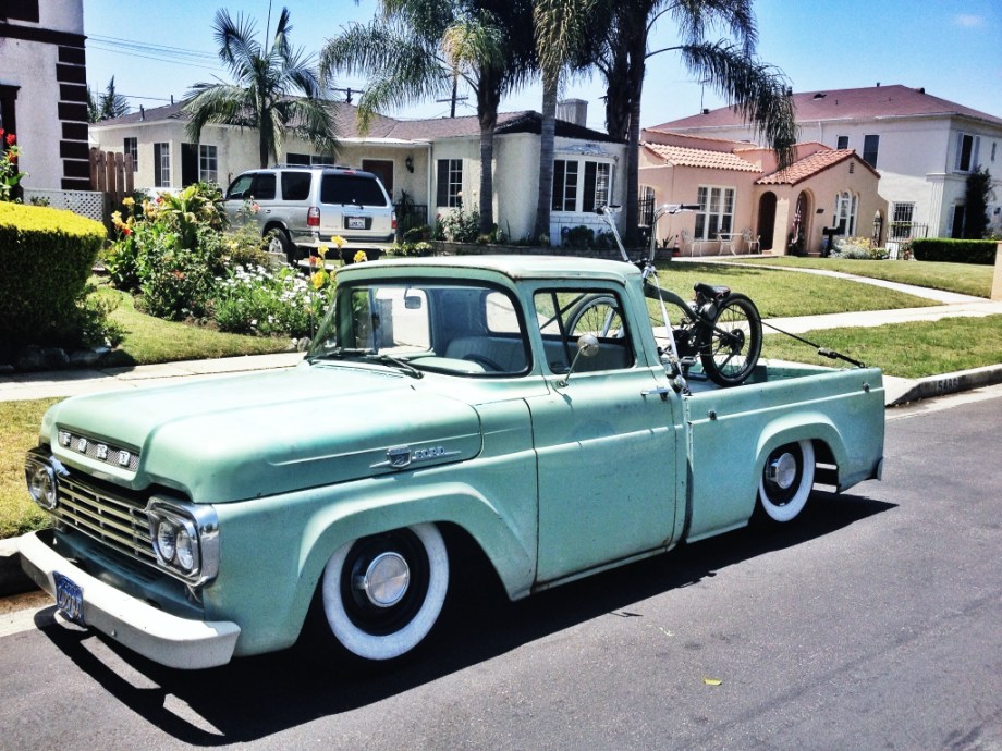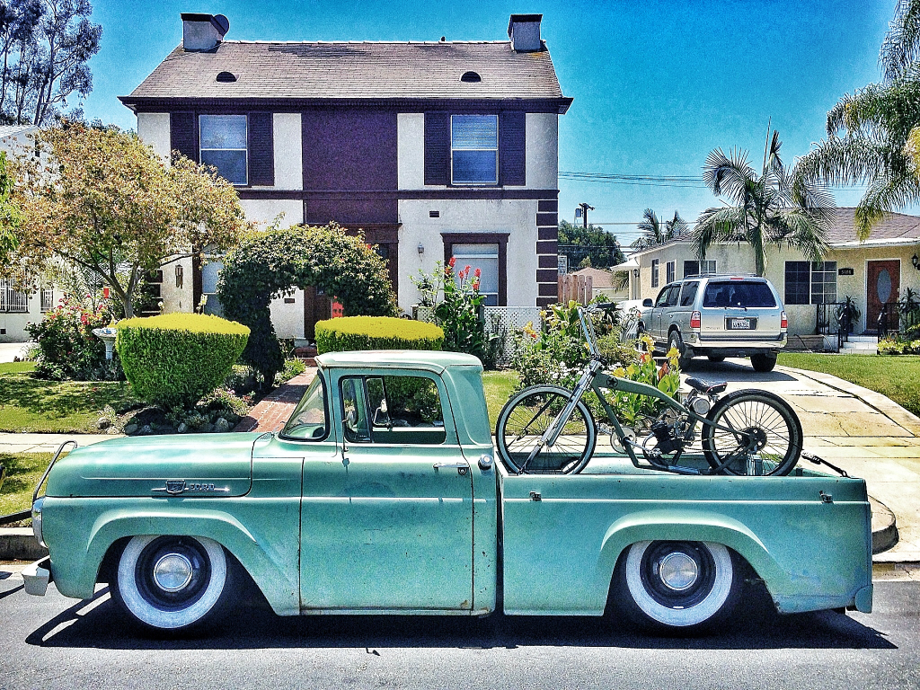 “My name is Blake Weddington. I live in los angeles california and bought this truck stock in Feb 2012. I found it on a farm in dinuba california and shipped it back to los angeles. it now has new interior, independant front suspension power steering and disc brakes rear step notch and parallel 4 link. air bagged all the way around. cheap wooden bed. i built. also, I built the motor bike in the bed of the truck and its a lowrider built off a felt frame chopped and lowered. Great site
